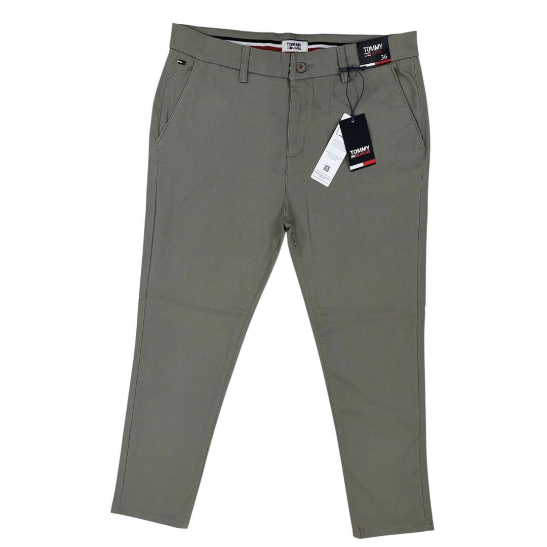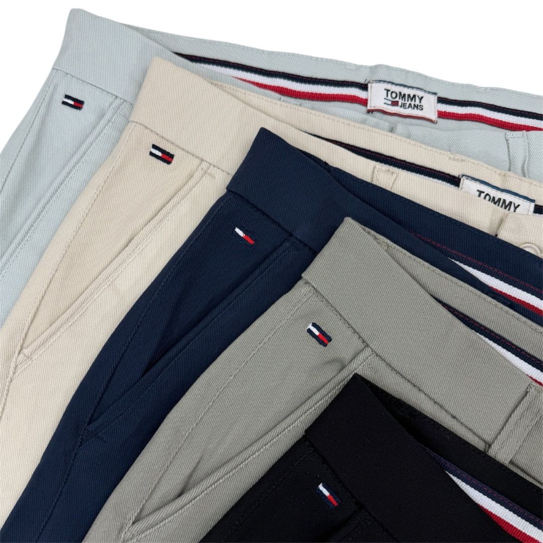 This image features a collection of five pairs of Tommy Jeans brand chino trousers, displayed in a variety of versatile, neutral colors. These pants appear to be a slim or straight-fit style, designed for a polished yet casual look.