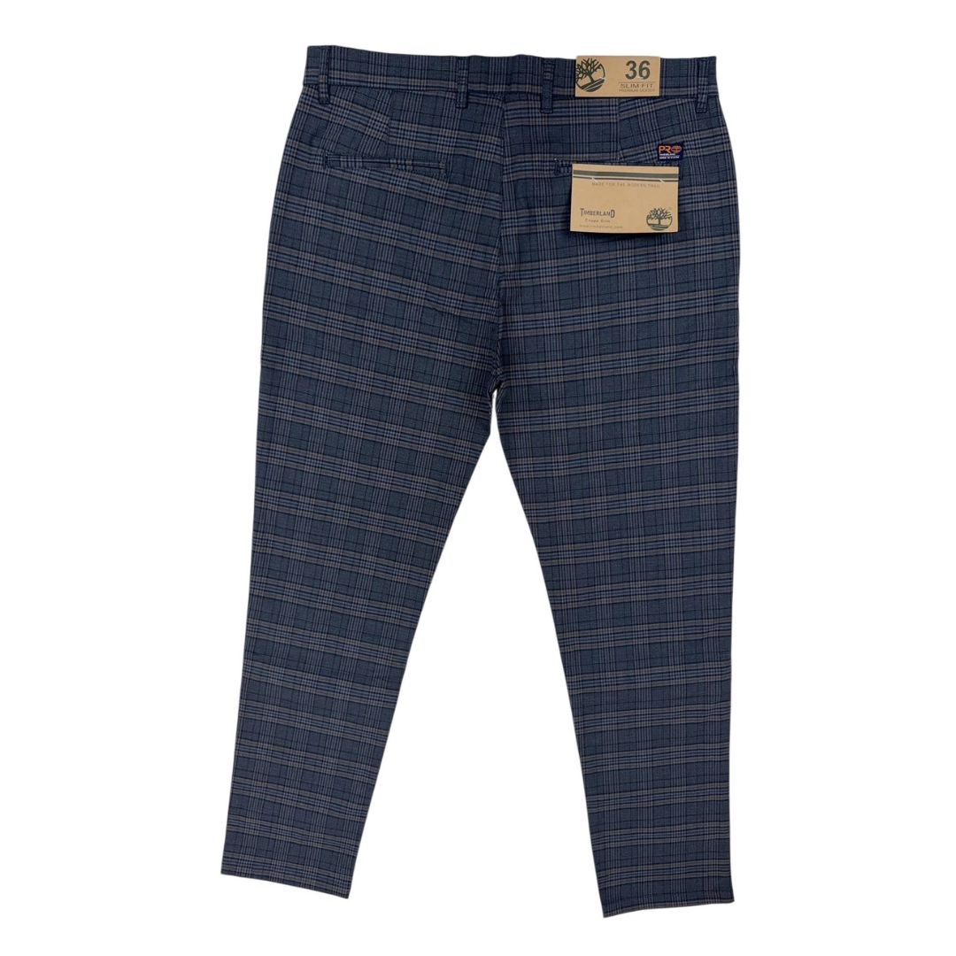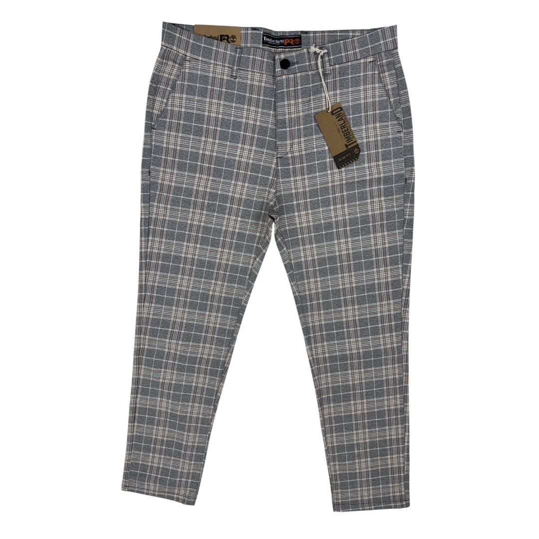 This image showcases a collection of five pairs of Timberland branded trousers, displayed in a vertical flat-lay arrangement. The collection highlights a variety of plaid and checked patterns in neutral, versatile tones.