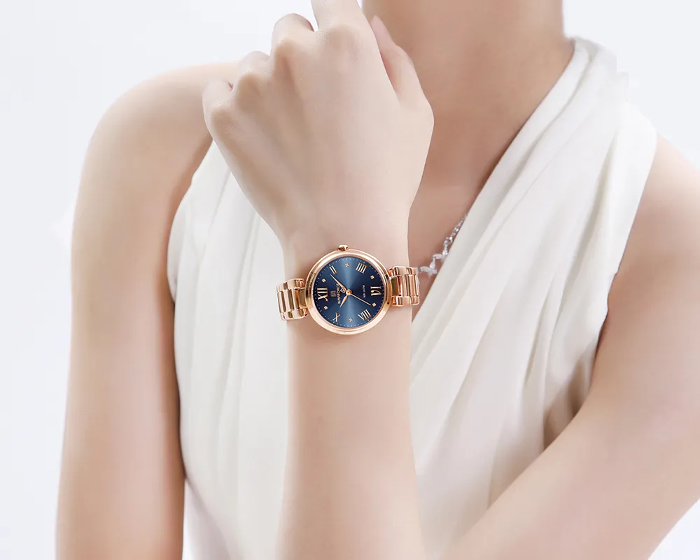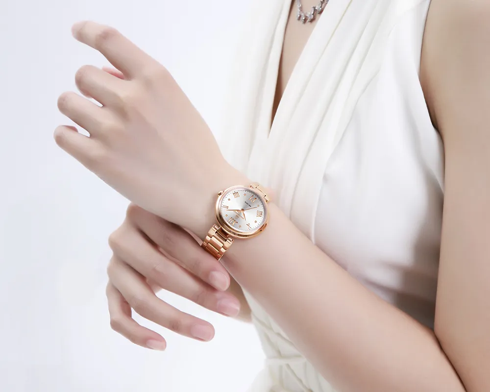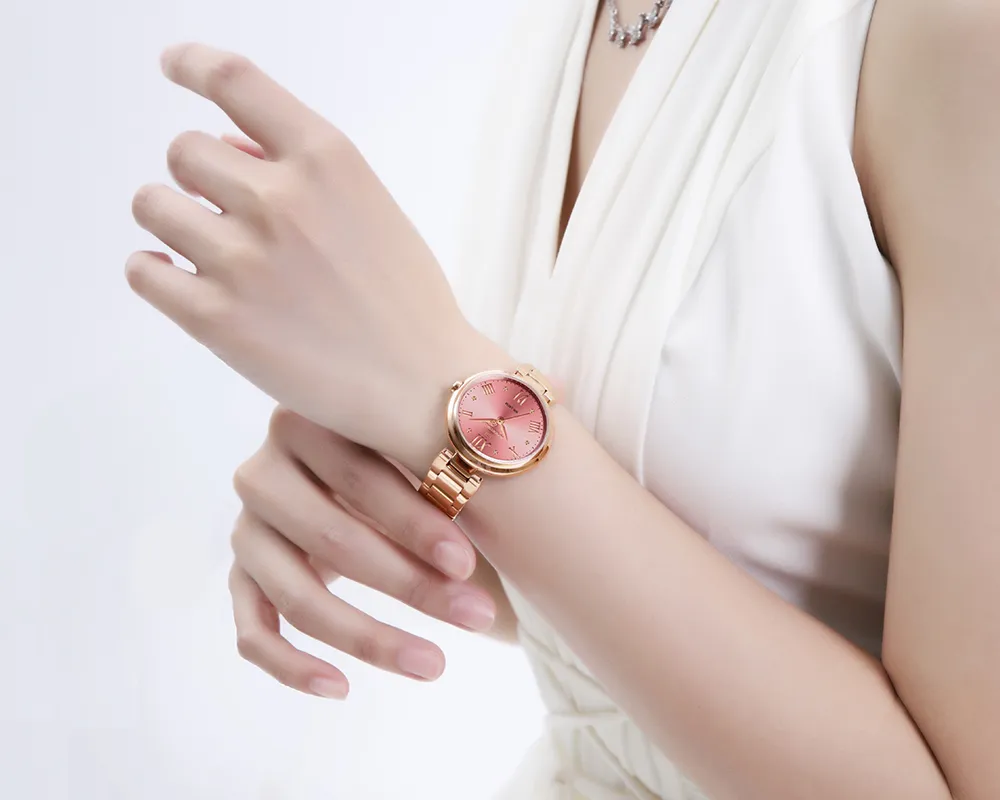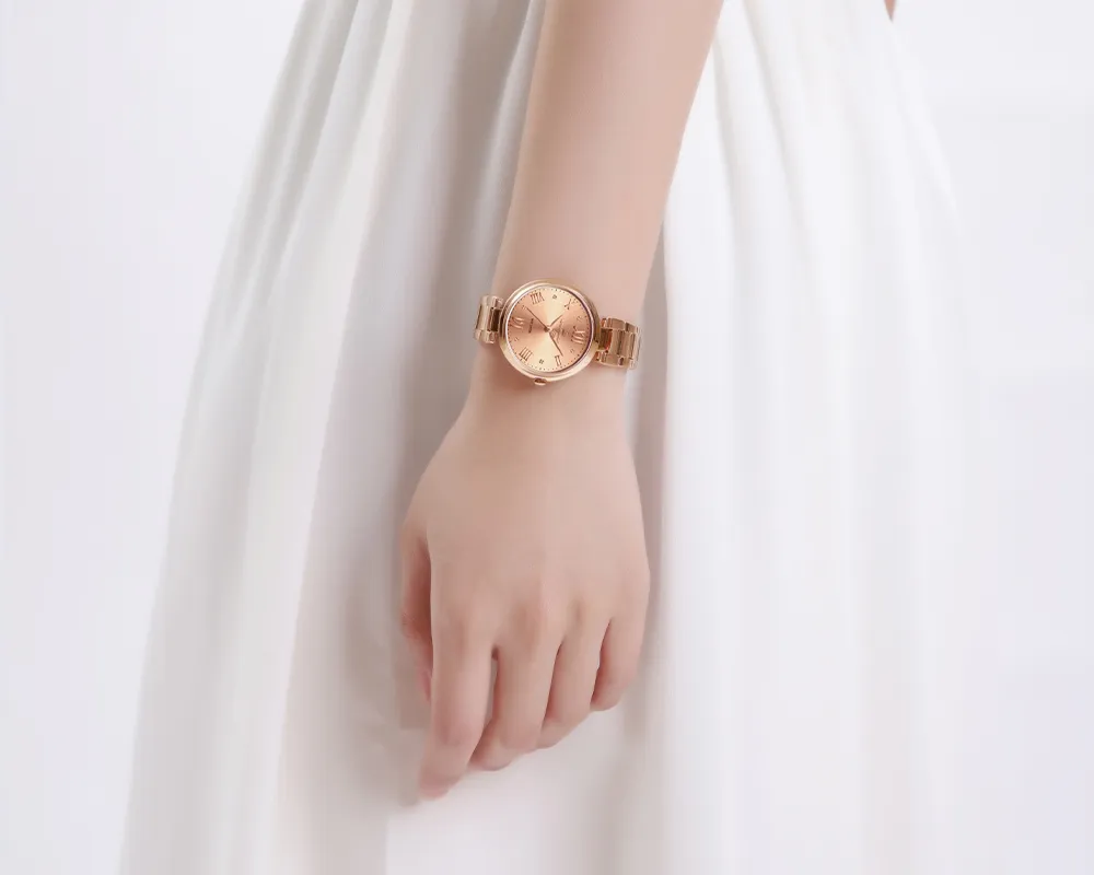 Bask in the sunburst dial's soft glow, complemented by classic Roman numerals. A delicate rose gold bracelet adds a proper metallic texture that's chic, minimalist, and modern.
