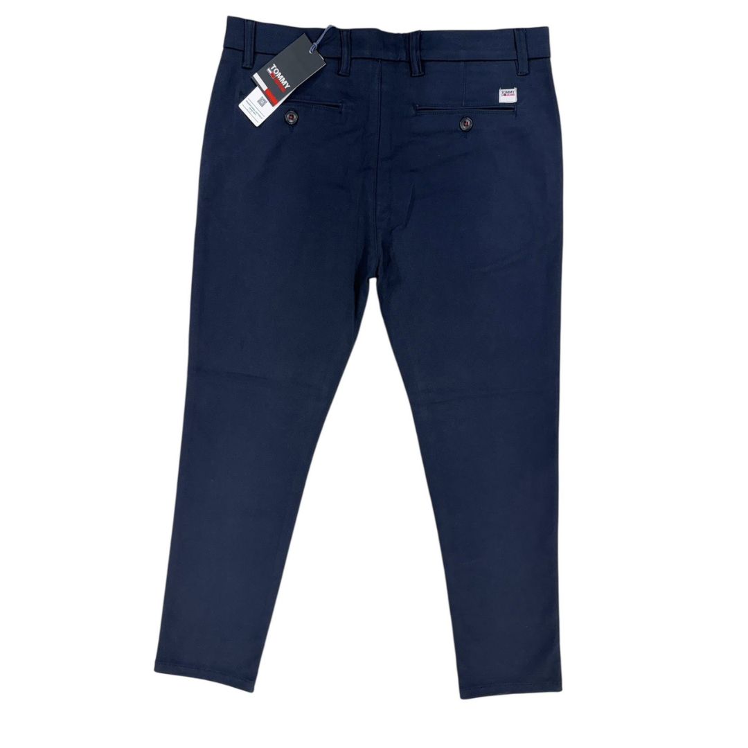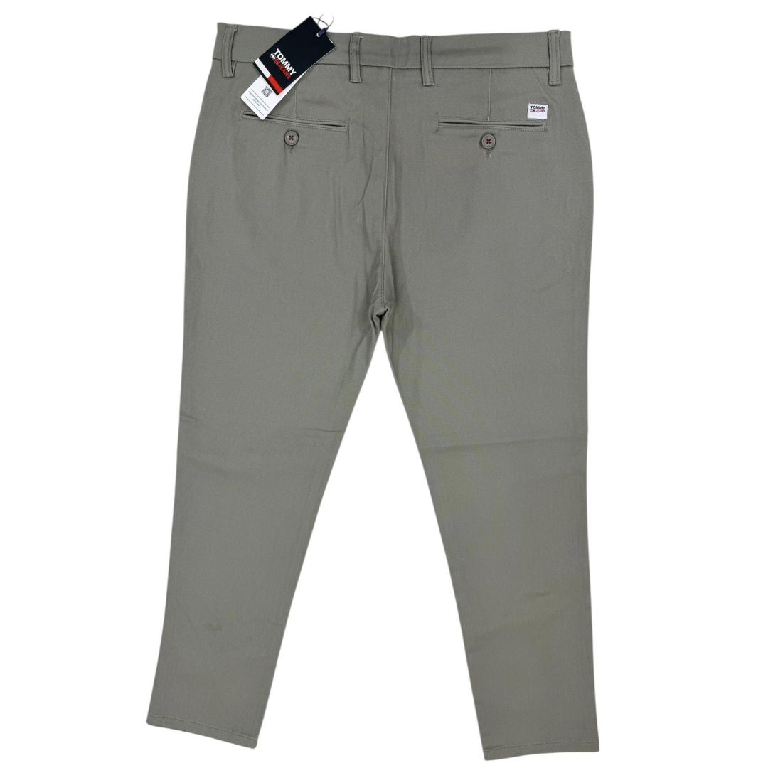 This image features a collection of five pairs of Tommy Jeans brand chino trousers, displayed in a variety of versatile, neutral colors. These pants appear to be a slim or straight-fit style, designed for a polished yet casual look.