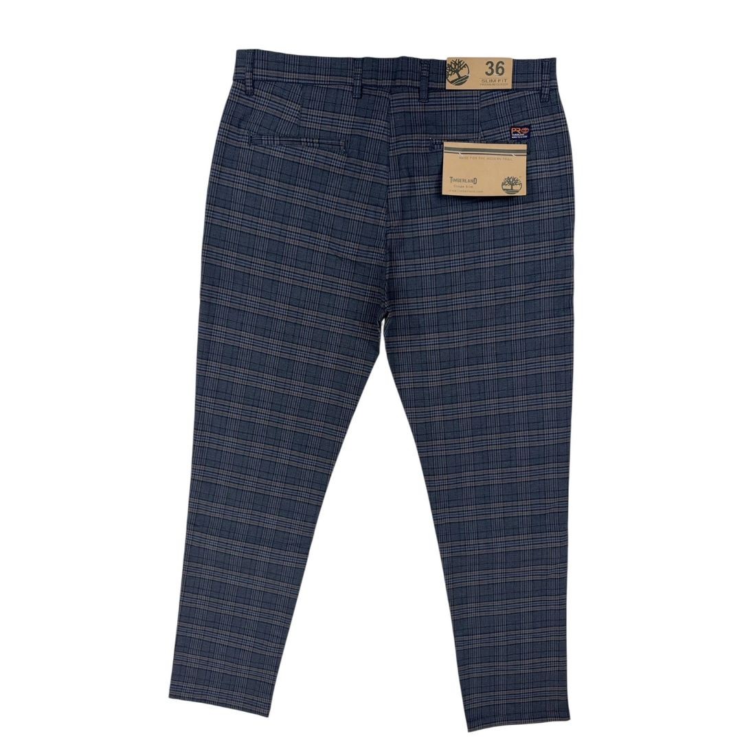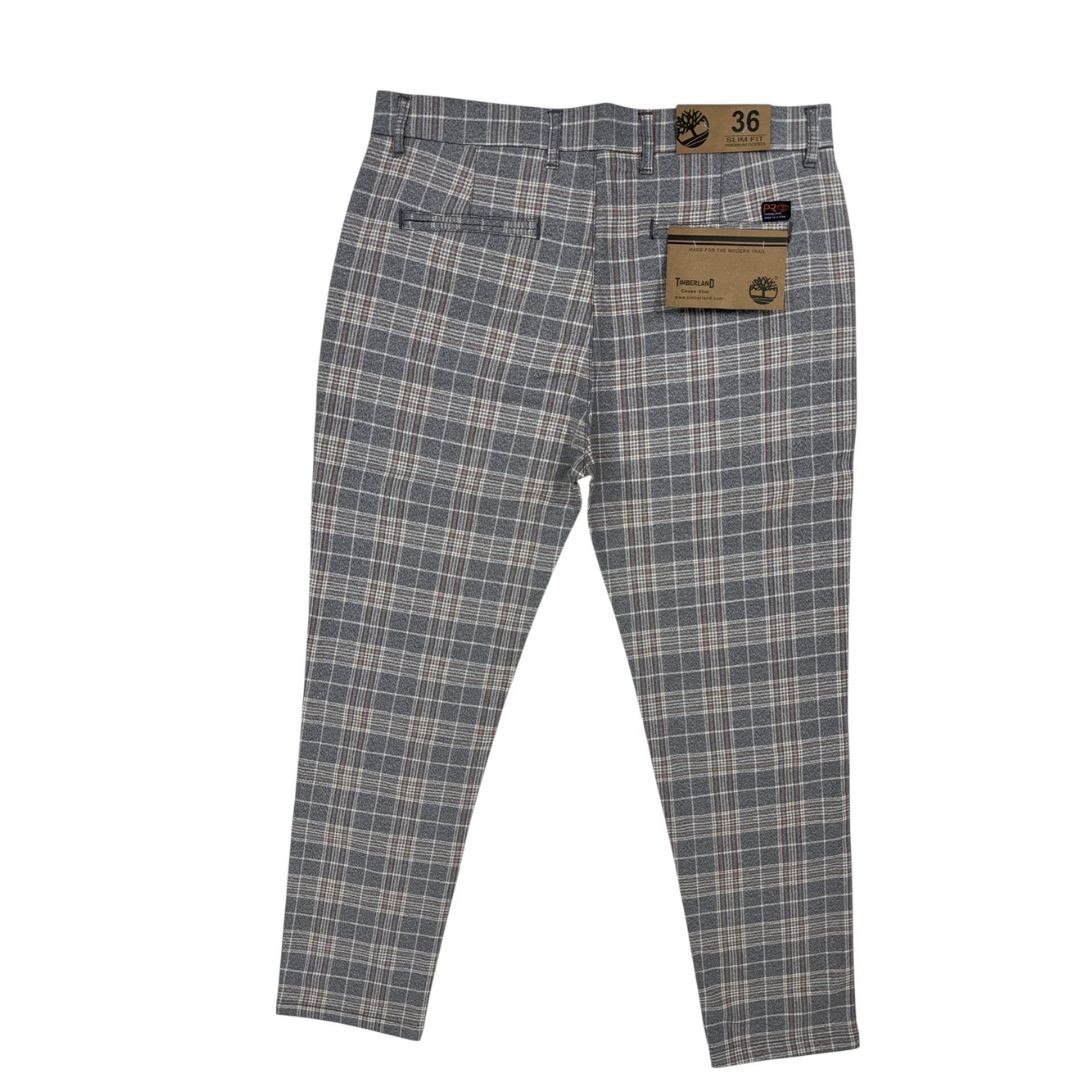 This image showcases a collection of five pairs of Timberland branded trousers, displayed in a vertical flat-lay arrangement. The collection highlights a variety of plaid and checked patterns in neutral, versatile tones.